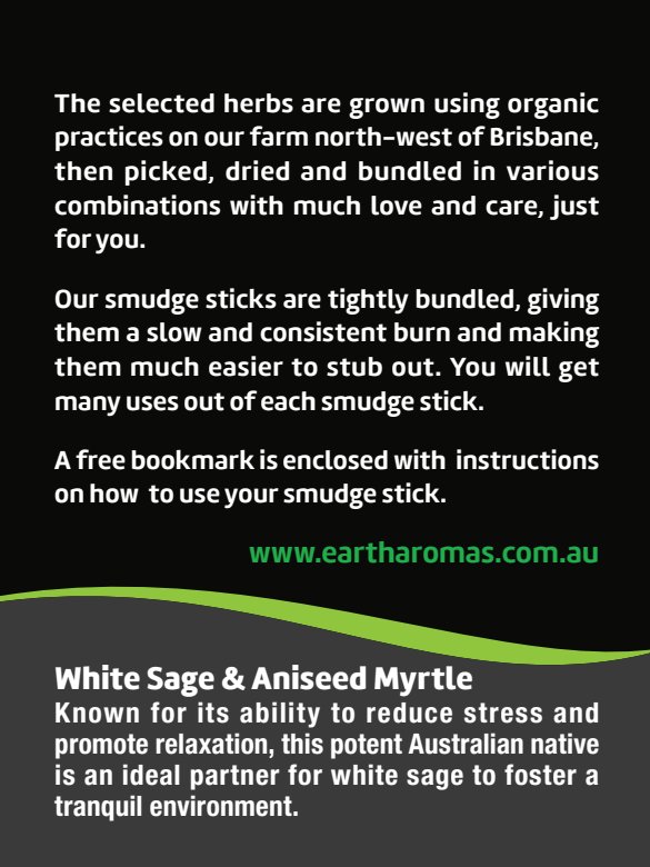 Infused with the essence of Aniseed Myrtle and White Sage, this blend harmonizes traditional Aboriginal wisdom with the art of smudging.
